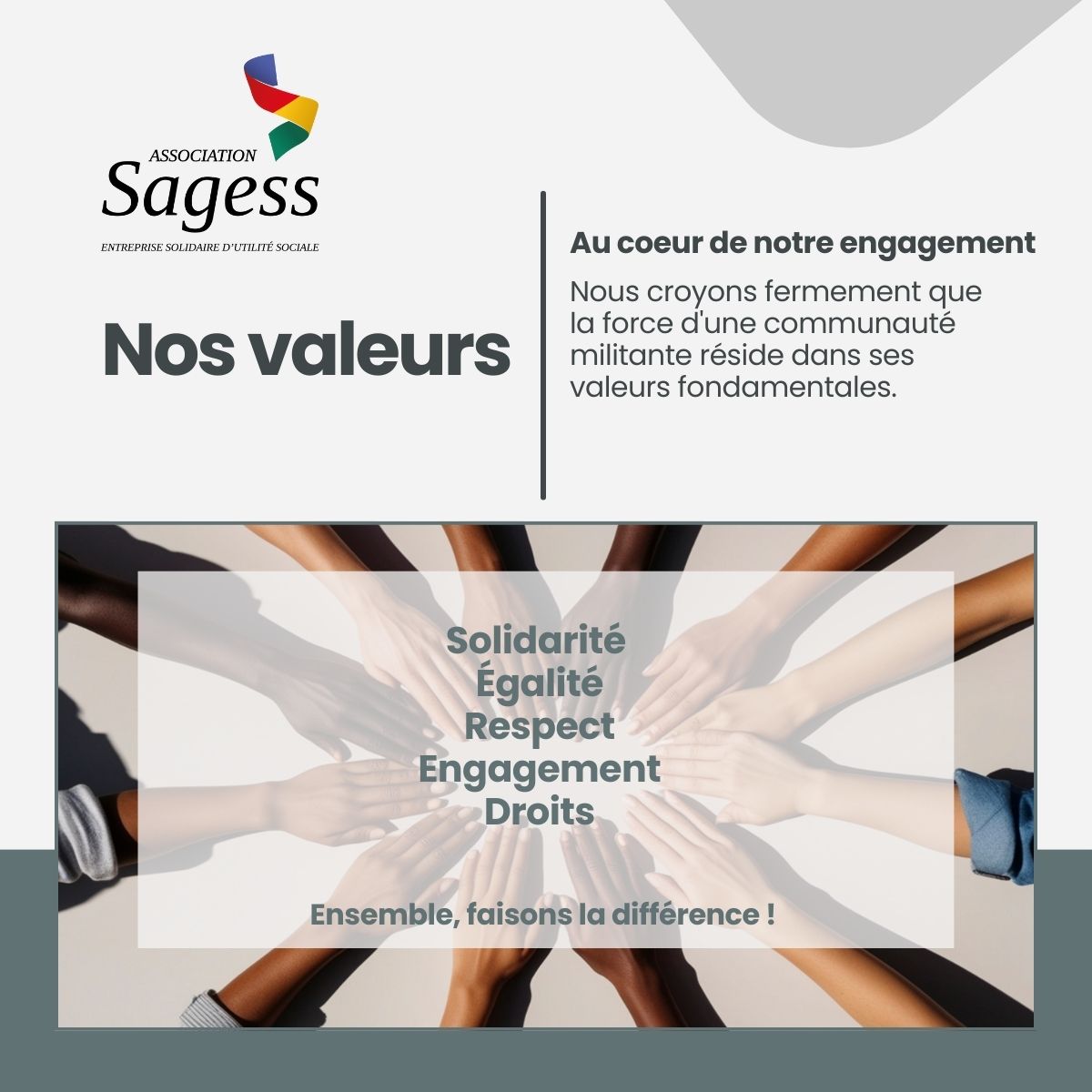 Une aventure humaine guidée par 5 valeurs : Solidarité, Égalité, Respect, Engagement, Droits.